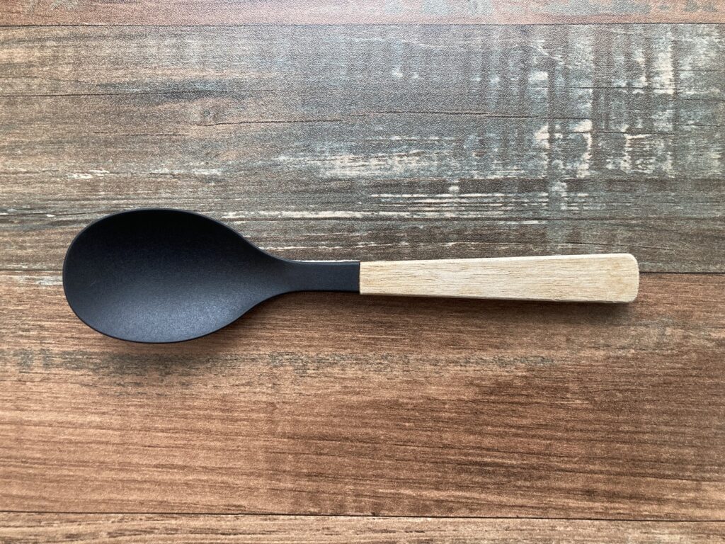 This spoon has a natural, wood-like handle that gives a warm, cozy feel. The tip is made of silicone, which is heat-resistant, so it’s perfectly safe to use for cooking.